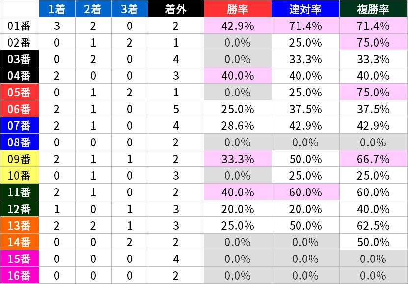 勝率10%、連対率20%、複勝率30%を超える馬番に色を付けてある。