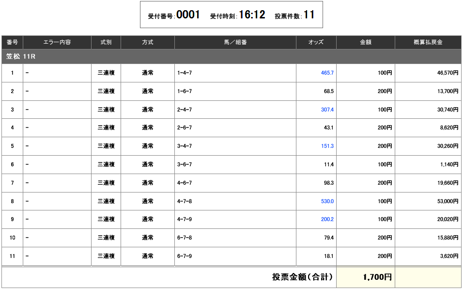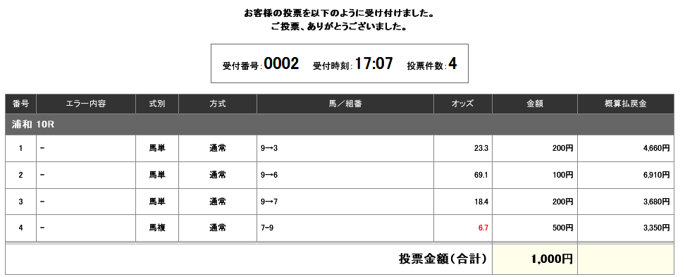 これは遊びで1000円買っただけのレースなのだけど、9▷6で入って「よっしゃ高め!」と喜んでいたら払戻金が69.1倍から3780円にダダ下がり。。。17時10分発走のレースなので、2分でこんなに下がるかね…。萎える。